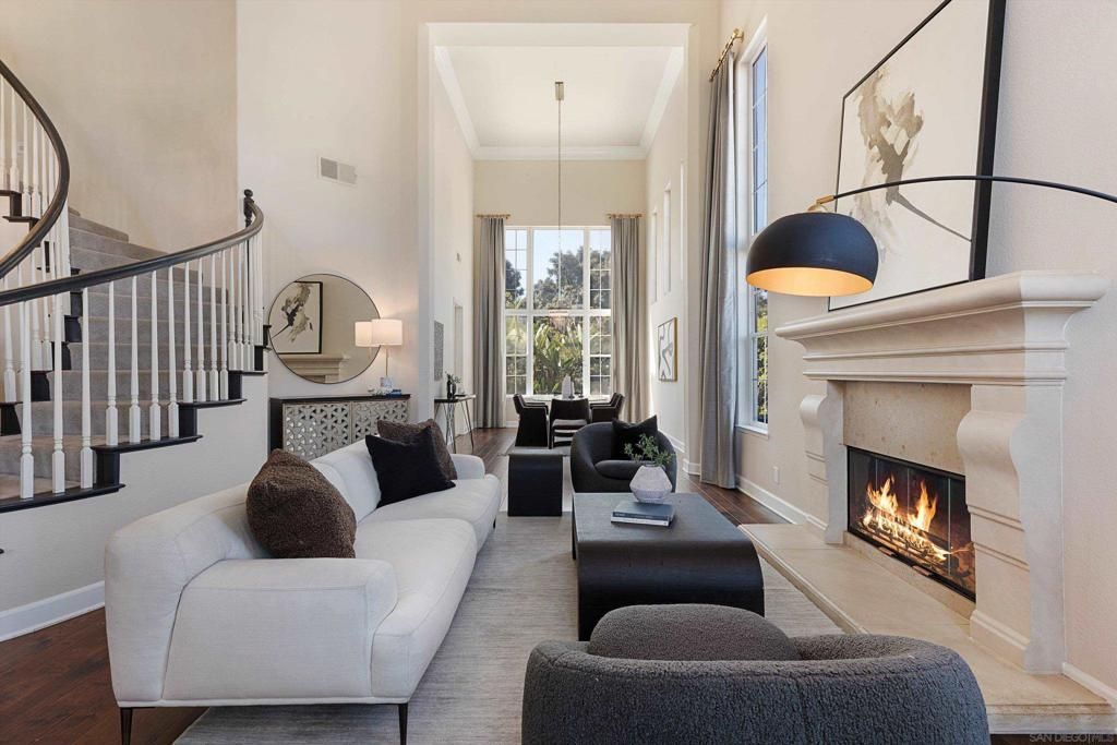 Set on a corner lot in Cantata at Aviara, 1405 Cressa Court is a former model home and the largest floor plan in a community where listings rarely become available. The home opens to formal living and dining rooms with 18-foot ceilings, oversized windows, and a limestone fireplace. Designer finishes are showcased throughout, with three fireplaces?in the living room, family room, and primary suite. The island kitchen is built for living and entertaining: a professional Bertazzoni gas cooktop, double ovens, built-in wine fridge, and quartz counters opening to the breakfast area and family room. A downstairs bedroom with full bath works as a guest suite or home office. Upstairs, the primary suite offers a fireplace, private balcony, spa bath, and treetop views. Three additional bedrooms, laundry, and an attached three-car garage with EV charger complete the layout. The backyard feels like a private escape?a pool, newly refinished deck, mature tropical landscaping, and multiple seating areas. Major upgrades include a new roof and owned solar (NEM1). The location defines the lifestyle: walking distance to Batiquitos Lagoon trails, minutes to Aviara Golf Club and Park Hyatt Aviara Resort, and a short drive to Carlsbad beaches. Top-rated Aviara Oaks Elementary and Middle are nearby. HOA dues cover common area landscaping, miles of walking trails, and perimeter fencing along Batiquitos.