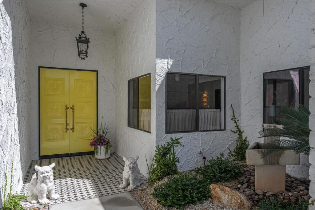 Located in the iconic Canyon Estates, this exceptional 4-bedroom, 3.5-bath residence is a masterfully reimagined home originally designed by Charles Du Bois. Blending architectural integrity with a thoughtful, design-driven renovation, this home offers refined desert living in one of South Palm Springs' most desirable communities.A private courtyard entry with the original Arabesque gate, custom tilework, and tranquil water feature creates a welcoming first impression. Inside, a dramatic one-and-a-half-story entry and original hand-carved doors honor the home's heritage, while wide-format Turkish limestone flooring flows throughout the interiors and into approximately 1,400 sq ft of covered outdoor living space.Designer finishes elevate every room, including curated wallcoverings and statement lighting by Kelly Wearstler. The kitchen is both elegant and functional, featuring a Wolf cooktop, Sub-Zero refrigerator, GE Profile ovens, Bosch dishwasher, quartz countertops, marble backsplash, and refinished cabinetry.All bathrooms have been fully renovated with premium materials from Ann Sacks, Walker Zanger, and Dal-Tile, complemented by Kohler fixtures and Toto toilets. The powder room is a standout with a custom quartzite feature wall. The primary suite offers a private retreat with custom closets, dual exposures, and direct access to a jasmine-scented garden with outdoor shower. Its spa-like bath includes Oceanside Glass mosaics, Newport Brass fixtures, and designer wallcovering.Outdoor living is equally impressive, featuring a redesigned saltwater pool and spa, expansive covered patios, a private terrace off the primary suite, and mature landscaping with mountain views--ideal for entertaining or relaxing.Modern upgrades include owned solar with Tesla battery backup, replaced windows, dual water heaters, and a well-maintained HVAC system, along with a two-car garage.Canyon Estates residents enjoy resort-style amenities including cable, Wi-Fi, landscaping, lush greenbelts with fruit trees, tennis and pickleball courts, a 9-hole executive golf course, and a clubhouse with fitness center, library, and lakeside patio.