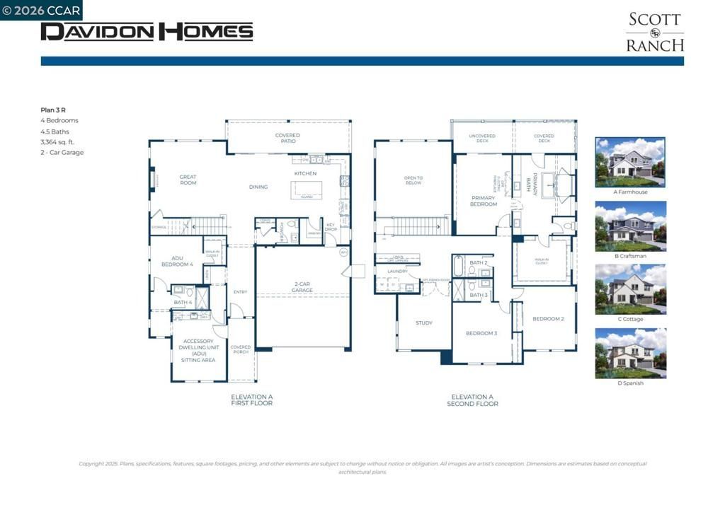 Introducing Scott Ranch by Davidon Homes, an exciting new home community nestled among the rolling hillsides of Petalumas tranquil west side. This incredible Plan 3, with four bedrooms and four and one-half baths in approx. 3,364 sf, includes an Accessory Dwelling Unit (ADU) with living room, kitchenette, private bedroom with full bath and separate entrance from the main house ? perfect for multi-generational households, live-in assistants and caregivers, or potential rental income. Designed to take advantage of the areas scenic beauty and gracious indoor/outdoor living and entertaining, the home features an expansive covered loggia on the main level and a private open air and covered balcony at the luxurious primary suite upstairs, Buyers who act quickly will have the opportunity to select from a curated collection of upgrades and options to personalize their new Scott Ranch home.