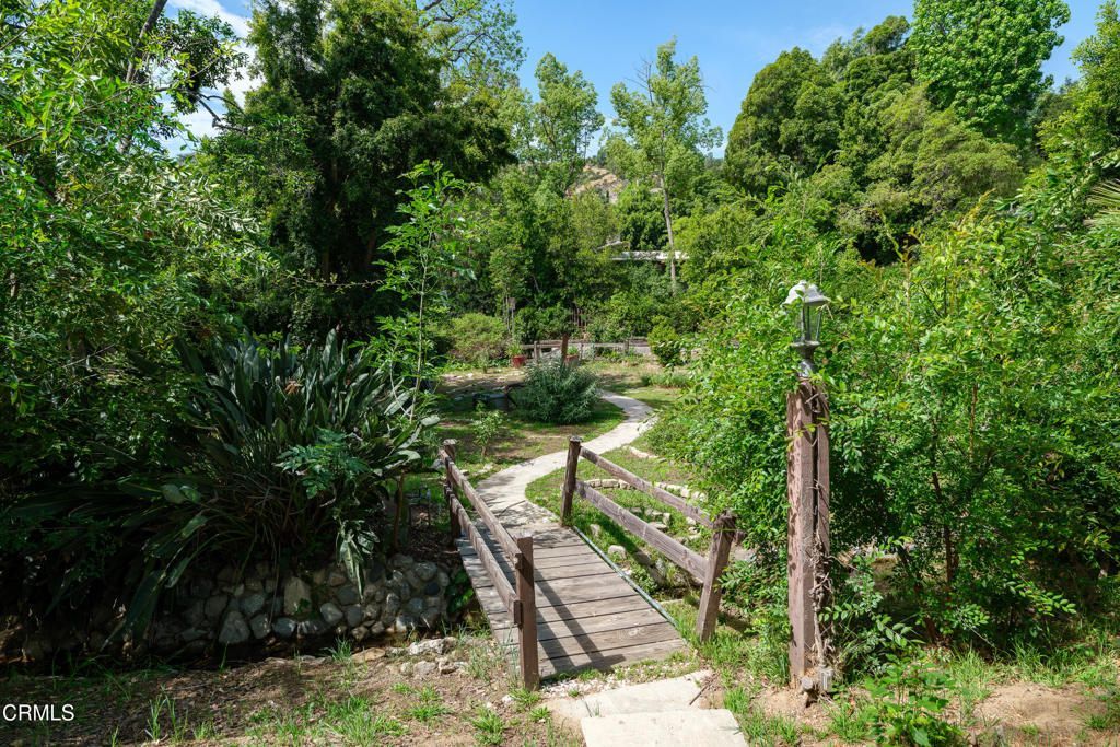 This architectural chef-d'oeuvre stands proudly on Niodrara Dr exuding elegance and timeless distinction. Built by a celebrated Hollywood home builder Robert Byrd known for crafting residences for the stars, the home is a true embodiment of distinctive California design. Upon entering, one is immediately transported into a world of rustic sophistication, where thoughtful details and intricate interiors create an atmosphere of warmth, charm, and enduring style.Nestled on an expansive lot, this enchanting property exudes romance and timeless charm. The sumptuous living room is anchored by a stunning brick fireplace framed with stained-glass windows, while original hardwood floors, exposed beam ceilings, and dramatic custom wood cabinetry create a warm, inviting atmosphere. Large windows offer picturesque views of the magical gardens beyond.Adjacent to the living room, the remarkable original kitchen is truly a work of art. Featuring brick walls, a built-in oven, flagstone floors, and beautifully preserved cabinetry, it blends rustic elegance with intricate wood detailing. The adjoining dining area opens seamlessly to a flagstone patio, perfect for indoor-outdoor living and entertaining.The main level also includes a serene primary suite with beamed ceilings and abundant natural light, along with a stylish powder room. A wooden staircase at the main entrance leads to a private guest suite above the garage, complete with soaring ceilings.Outdoors, the property is further enhanced by multiple terraces, a charming wooden bridge, mature trees, and lush, thoughtfully designed gardens showcasing a diverse array of plantings. This extraordinary residence offers a rare opportunity to own a piece of architectural history, set within an environment of refined beauty and tranquility.