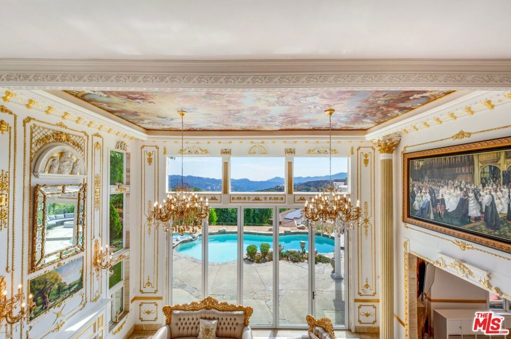 Welcome to Versailles Topanga, a stunning storybook jewel offering panoramic canyon and mountain views, with even distant glimpses of Catalina Island. Nestled on the largest lot at the end of a cul-de-sac, this home ensures complete and gated privacy. Designed and executed in period-authentic 18th Century French Rococo, this masterpiece features custom panels throughout the house designed by Rococo artists and hand-gilded in 23.75 karat gold-leaf, using techniques and materials true to the Rococo Era. Custom-commissioned artwork from the period is embedded throughout the home, adding to its historical charm. The wrought iron balusters, designed and gilded onsite, are modeled after those in the French Embassy, adding a touch of regal elegance. The lower level boasts custom marble medallions, double inlaid Onyx floors, and commercial-grade large format Crema Marfil (Spain) Marble and Marble Baseboard. The magnificent living room boasts soaring, high ceilings in luxurious, walls of floor to ceiling glass and windows framed with Onyx marble casings and Greek Thasos Marble Trim, creating a grand and luxurious ambiance. The open floorplan concept offers a panoramic view of the interior living areas from the grand entry foyer to the opulent living room, the royal formal dining designed with custom built furniture, to the casual family room with romantic fireplace, opening up to a dream granite kitchen with island, new double subzero, two ovens, two stove cooktops, garden window and more panoramic views! There is a large guest bedroom suite on the main level, powder room and laundry room. The elegant wrought iron gold-leaf staircase leads to the upper level, all bedrooms feature double 1 maple borders manufactured in-house around real oak flooring, with custom archways designed to highlight your art collection. The luxurious primary retreat, sitting room and office showcase intricate wooden inlaid floors with borders and Pakistani Red Onyx Marble Baseboard. The primary spa-like bathroom is a haven of relaxation, with book-matched honey onyx up the spa tub, marble borders and inlays made in-house, a steam shower, jet tub, the huge primary suite offers a sitting room, panoramic views, a huge deck, and two large walk-in custom closets. This home also includes a huge home theater, art and music studio, one thousand bottle, temperature-controlled custom wine cellar. You will be blown away by the unobstructed views from almost every room. Extra-large and flat back yard with entertaining pool and spa, a huge built-in BBQ, and manicured lawns with a gazebo make this an entertainer's paradise. No detail was spared in the design of this home. Unique and totally magical, Versailles Topanga is a masterpiece like no other. Nothing else compares!