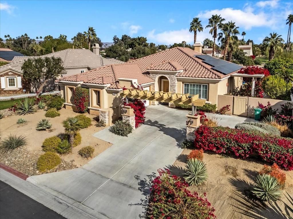 Discover VISTA MIRAGE, a tranquil gated community situated in the beautiful Rancho Mirage. This is an extraordinary opportunity for discerning buyers seeking exceptional value in their next home. This exquisite residence features 3 generously sized bedrooms and 2 contemporary baths. The welcoming family room is enhanced by a charming fireplace, while the updated kitchen boasts beautiful quartz countertops, stainless steel appliances, and a brand new refrigerator. Both bathrooms have been tastefully modernized, with the primary bath now showcasing a stylish closed shower door. Throughout the home, elegant tile floors and plantation shutters add an air of sophistication. Step outside to relax in your private oasis, featuring a pebble tech pool and spa, along with a fire pit that's ideal for entertaining on cool evenings. The outdoor space is enhanced by new patio furniture, providing a stylish and comfortable setting for gatherings. Additional highlights include a 2-car attached garage and low HOA dues. Recent upgrades feature attractive desert landscaping and a solar lease that the buyer must assume, with 7 years remaining. Electric bill is $270 per month. As a bonus, this home is offered furnished (per inventory), making it an ideal choice for either full-time living or a seasonal getaway. Don't miss out on this exceptional opportunity--call today to schedule your private showing!