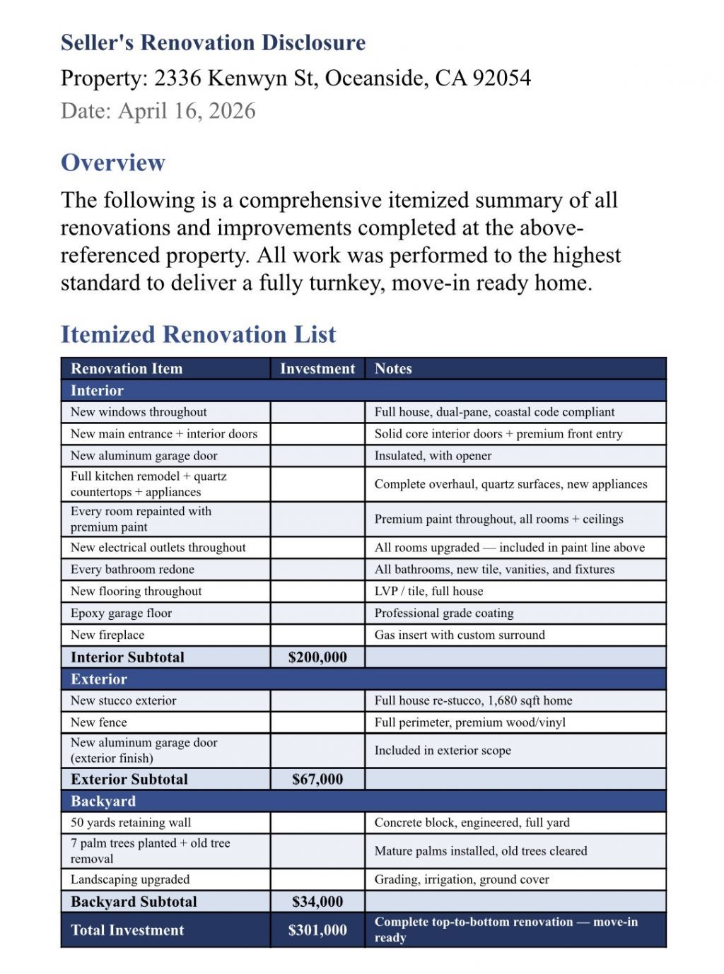 Welcome to 2336 Kenwyn Street ? a fully reimagined single-family home in Oceansides coveted Fire Mountain neighborhood, just minutes to the beach by car or bike. Extensively upgraded with over $300,000 in renovations, this turnkey home offers a true move-in ready experience. The remodeled kitchen includes quartz countertops, new appliances, and all-new cabinetry, while bathrooms have been fully updated with new tile, vanities, and fixtures. Upgrades continue with new flooring throughout, new electrical throughout, a new fireplace, dual-pane windows, new main entry and interior doors, walls feature a Level 5 skim coat with premium paint for a smooth high-end finish, and a garage with epoxy flooring. Exterior improvements include full re-stucco, new fencing, and a new aluminum garage door. The redesigned yard features a 50-yard retaining wall, palm trees, and refreshed landscaping. Situated on an approximately 10,000 sqft flat lot ? rare for Fire Mountain ? the property is ideal for adding a pool, ADU, or both. Conveniently located near beaches, dining, shopping, and Interstate 5, this home delivers the best of coastal North County living with quality and upgrades rarely found at this price point.