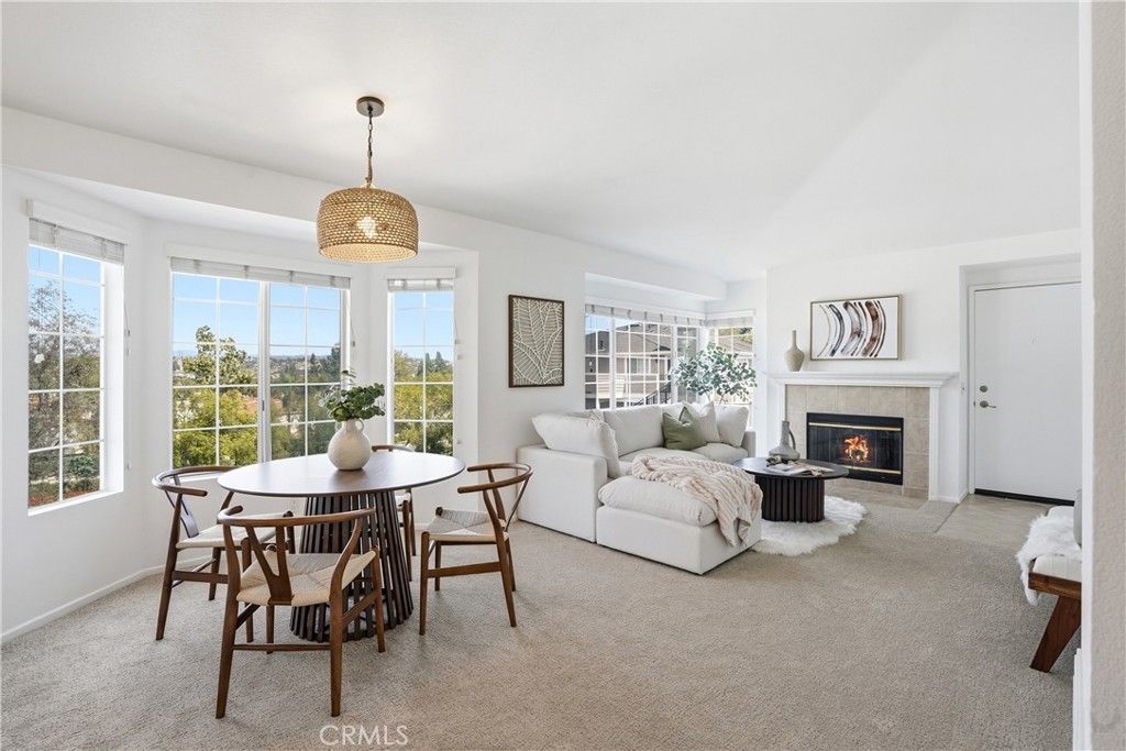 Spectacular mountain and city light views, abundant natural light, an open-concept floor plan, and a quiet location define this Aliso Viejo condo, creating a bright and inviting living environment with a wonderful sense of privacy and elevation. The main living area captures scenic views and a spacious feel, with an open layout designed for both everyday living and entertaining, while thoughtfully placed windows bring in natural light throughout the day. The interior features new carpet, freshly painted walls, and updated lighting accents, offering a clean, move-in-ready space with a neutral palette The kitchen includes granite countertops, ample cabinetry, generous storage, and a stainless steel refrigerator, with a layout that connects seamlessly to the main living area, making it ideal for daily living and gatherings while also capturing beautiful mountain views from the kitchen window. The bedrooms offer large closets, providing comfortable living space and functional storage. Positioned on the top level, the home benefits from added privacy, reduced noise, and elevated mountain views while maintaining a practical single-level layout. Just outside the front entry, a private balcony offers an additional outdoor space to enjoy fresh air and surrounding views, creating a quiet retreat separate from the main living area. A newer A/C unit installed in 2025 adds efficiency and year-round comfort. The home also includes a shared interior stair access leading to the garage level providing convenient covered access to your one-car garage and an assigned parking spaced for ease of living and everyday convenience. Community amenities include multiple pools and spas, clubhouses, a fitness center, and well-maintained greenbelts and open spaces. Ideally located near Aliso Viejo Town Center, shopping, dining, parks, and nearby hiking and biking trails, with Laguna Beach and coastal destinations just a short drive away, this home offers an exceptional combination of light, views, privacy, and convenience.