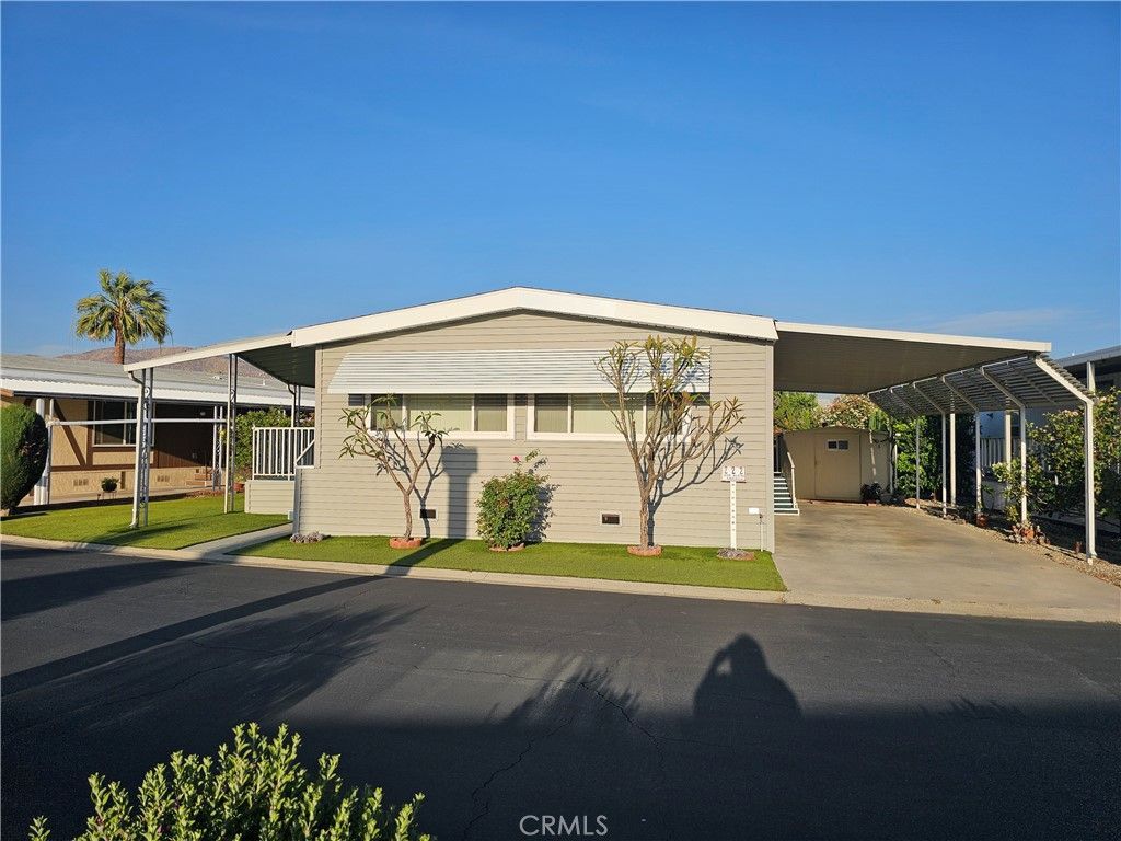 Welcome to 23820 Ironwood Ave #222, located in Moreno Valleys desirable 55+ community. This beautifully maintained 2-bedroom, 2-bath home offers approximately 1,536 sq ft of bright, open living space with high ceilings, a skylight, and beautiful wood flooring throughout. The home also features dual-pane windows, custom blinds and drapes, and an indoor laundry area for added convenience. Step outside to a welcoming front porch, perfect for relaxing, along with an outdoor shed for additional storage. The covered carport accommodates up to 2 standard-size vehicles. The community offers resort-style amenities including a pool, spa, clubhouse, gym, card room, and pool hall. Conveniently located within walking distance to nearby shopping and dining. This move-in-ready home offers comfort, convenience, and a relaxed lifestyle. Schedule your private showing today. The property is on leased land with a monthly space rent of $850.