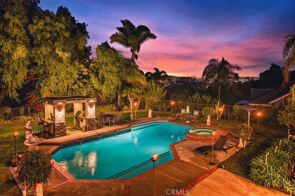 NOW PRICED TO SELL - RARE FLAT LOT OPPORTUNITY IN NELLIE GAIL RANCH! Hard to find and rarely available, this exceptional property offers one of the most usable, private, and expansive 21,000+ sq ft lots in Nellie Gail Ranch- complete with a large side yard/RV access, resort-style pool, and premium outdoor living. Backing to open space with no home behind, enjoy breathtaking views of rolling hills, lush greenery, and city lights in a peaceful, scenic setting. Designed for true California indoor-outdoor living, the backyard is an entertainers dream featuring a replastered oversized pool & spa with triple waterfalls, lush lawn, and multiple gathering areas. At the center is a fully equipped Viking outdoor kitchen with beer tap, refrigerator, burners, sink, built-in sound system, and custom lighting - perfect for hosting unforgettable gatherings or relaxing evenings at home. The home offers 3,438 sq ft of bright, functional living space with vaulted ceilings, hardwood and tile flooring, and a flexible layout including 4 bedrooms plus a large office (optional 5th bedroom), with two bedrooms on the main level- ideal for guests or multi-generational living. The spacious primary suite includes a retreat, fireplace, view deck, and spa-style bath. Beautifully maintained and full of natural light, this home presents an incredible opportunity to update and customize while enjoying a premium lot and lifestyle that is rarely available. Additional highlights include 3-car garage, new PEX repiping, and access to trails, parks, top-rated schools, and the Nellie Gail Swim & Tennis Club. Best value for a flat, usable lot in the community - priced to attract immediate interest.