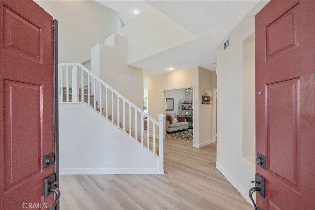 Welcome to this beautifully renovated, turnkey home nestled in the heart of Stevenson Ranch on a quiet cul-de-sac, offering privacy, stunning views, and a truly tranquil setting. This bright and airy residence features soaring vaulted ceilings and abundant natural light, creating an open and inviting atmosphere throughout. Thoughtfully updated, the home showcases new luxury vinyl plank flooring, fresh interior paint, updated baseboards, and stylish new light fixtures that bring a modern, cohesive feel. The kitchen features updated Caesarstone countertops, while all three full bathrooms have been tastefully remodeled to reflect both comfort and contemporary design. New windows throughout?including a new sliding door in the primary bedroom?enhance both natural light and energy efficiency. The flexible floor plan offers four spacious bedrooms upstairs plus an additional bedroom downstairs which is currently used as an office. Or use it as a bonus room or workout room. Downstairs also has a full bath perfect for guests or inlaws. The primary suite includes a walk-in closet and a private Trex deck?perfect for enjoying a cup of coffee on peaceful mornings and taking in the views. Step outside to your private entertainers backyard, complete with a custom Pebble Tec saltwater pool and spa, an in-ground fire pit, and mature landscaping that provides beauty and seclusion. Enjoy sun-filled mornings and shaded afternoons in this tranquil outdoor setting?ideal for both relaxing and hosting. Additional highlights include 32 fully paid-for solar panels, a new water heater, and a three-car garage with enclosed overhead storage. This home seamlessly blends modern upgrades, comfort, and exceptional indoor-outdoor living?ready for you to move in and enjoy.
