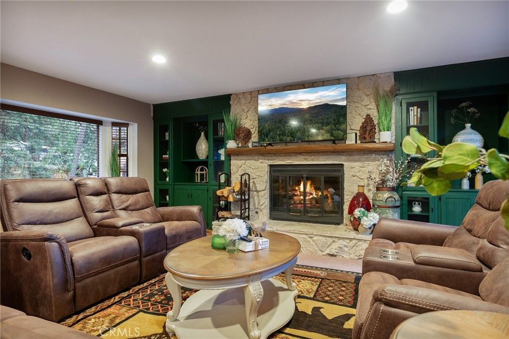 WOW, WOW, WOW!!! Looking for a Super Cool RUSTIC CABIN with a GREAT MOUNTAIN VIBE to Escape to? YOU WILL ABSOLUTELY LOVE this One with it's A-Frame Windows, Woodburning Stove and Cutesy Mountain Touches Throughout! You Won't Feel Cramped Here with Five Bedrooms Generously Spaced Apart, including an En Suite Bedroom on the Main Level! The Oversized Family Room is Sooo Dreamy with a Cozy Wood Burning Fireplace and HUGE WINDOWS Everywhere to Watch the Snow Fall! Did I mention Snow? Just a 10 Minute Drive to Snow Valley Ski Resort (Woot, woot!) and 15 Minutes to the Lake Arrowhead Village! The Island Kitchen with Breakfast Bar for the Kiddos has Oodles of Storage Space & Looks out to the Wall of Windows that Opens to the Amazing Back Deck Area! The Decking Runs the Length of the House and Has Multiple Sitting Areas that Overlook the Forest. PERFECT FOR ENTERTAINING!!! So Peaceful and Serene!!!! The 5th Bedroom Has a Separate Entrance Down Below. Recently this Home Has Been a Very Successful Air Bnb, Bringing in Approx $500/night!! Totally Level Entry into this Home too and a Big Backyard Makes this a Perfect Full time Home too! Come & See!!