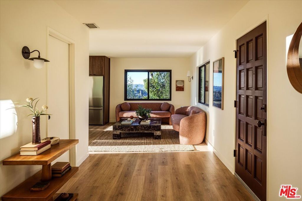 Turn-key Spanish hills home with panoramic views from every window, privacy, and great natural light south of the Boulevard. The designer reimagined home is set back off the street featuring stylish touches and high end finishes tucked away yet just a short drive to Ventura Blvd. New flooring, bespoke light fixtures and hardware, new Milgard windows and sliding glass doors, and an assortment of beautiful tiles adorn this one of a kind home. The kitchen has leathered granite countertops, walnut cabinetry, bronze hardware, brass light fixtures, all new appliances, accented by a built-in breakfast nook overlooking the hillside and adjacent lounge area. Off the kitchen is a large deck with room for dining and lounging. A classic Spanish step down living room lit by wall sconces and a tiled double sided wood burning fireplace is flanked by the generous formal dining room also with hillside views, and additional den or office downstairs. Upstairs the large primary bedroom suite features its own balcony with mountain and tree views, walk-in closet, and an en suite bathroom clad in limestone, cement, and walnut. Three additional guest bedrooms upstairs and guest bathroom with double vanity, soaking tub, and unlacquered brass hardware are complemented by a built-in reading nook at the top of the staircase framed by a large window and skylight. The backyard features a large outdoor entertaining area with a built-in BBQ and hot tub all in complete privacy with 180 degree deep views of the surrounding green hillsides. Gardens areas below, and additional green spaces and gardens flank both sides of the house. Direct entry two car garage and just a short drive to markets, restaurants, coffee shops, hikes, and more at the bottom of the hill. A stunning, unique designer Los Angeles hills home in Woodland Hills.
