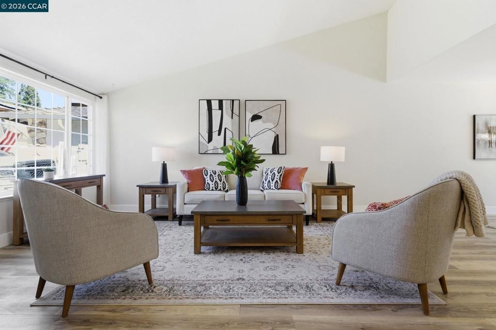 Vaulted ceilings, expansive living spaces & a private backyard with pool define this 4-bedroom home plus a dedicated office, set on a quiet court. Natural light pours through oversized windows into the living & dining areas, while a separate family room with fireplace offers a comfortable place to gather or unwind with direct backyard access. The kitchen is well-equipped with dual ovens, generous cabinetry & a dining nook anchored by a built-in beverage bar with fridge, opening directly to the patio & pool area. An indoor laundry room & powder room add convenience. Upstairs, the primary suite offers dual sinks, a jetted tub & a separate shower with dual shower heads beneath a skylight that brings in natural light. Three additional bedrooms share an updated hall bath with a jetted tub & tubular skylight. Additional highlights include owned solar, recently updated LVP flooring & carpet, a tankless water heater & overhead garage storage. The backyard features a pool, patio for outdoor dining, lawn space & mature landscaping that creates privacy & usable outdoor space. Located near neighborhood parks, hiking trails & top-rated schools, with easy access to downtown Claytons shops, dining & community events, plus convenient commuter routes.