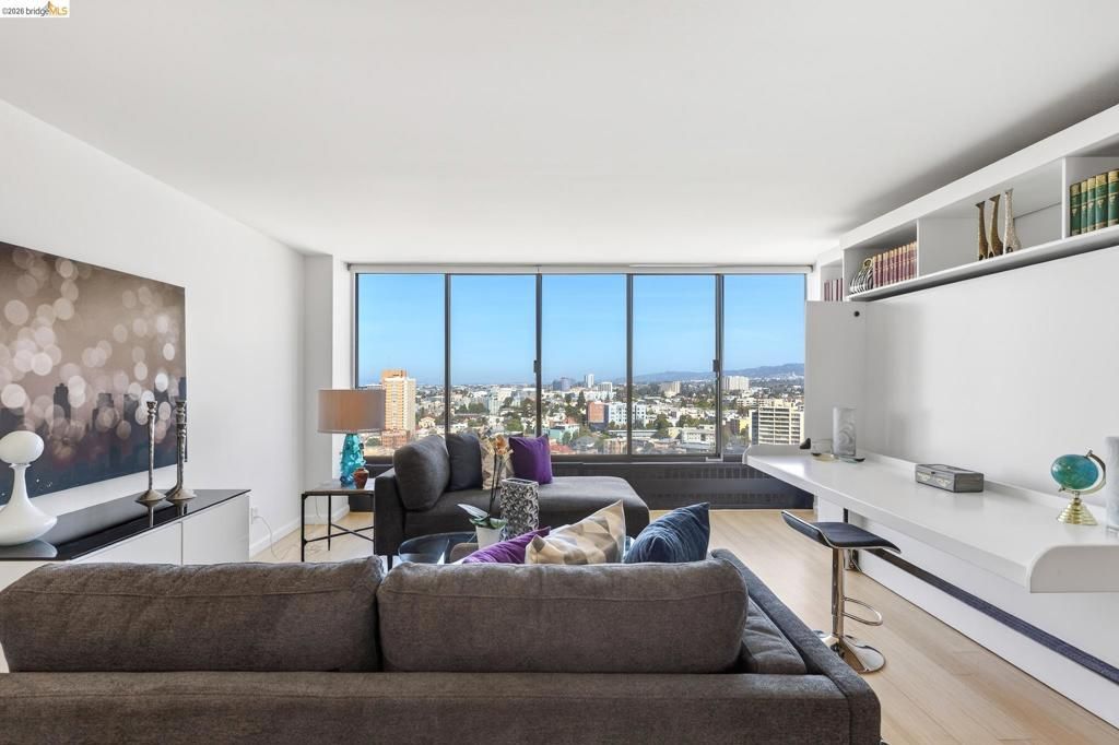 Soaring above Lake Merritt on the 22nd floor, this fully remodeled, ultra-chic 1-bedroom, 2-bath condo delivers some of the East Bays most iconic views?Lake Merritt, the San Francisco skyline, Mt. Tam, Oaklands glittering city lights, and UC Berkeleys historic campanile. Inside, a stylish open layout and expansive windows frame the panorama from sunrise to sunset. Sleek contemporary finishes and a thoughtfully updated kitchen offer both design and function, with plentiful storage and counter space. The generous bedroom lives like a private suite, and a cleverly integrated Murphy bed that converts to a desk adds incredible flexibility?perfect for guests or a polished home office. Two full baths provide extra comfort and convenience. The amenity-rich building features an expansive pool, a well-equipped gym/weight room, and 24-hr security: all included with the HOA?making it easy to enjoy a resort-like lifestyle at home. Parking is available for one car for an additional fee. Located in a coveted lakefront high-rise, youre moments from: *Lake Merritt paths, gardens, and rowing/boating *Whole Foods and neighborhood cafés *Grand Lake, Lakeshore, and Uptown dining, shops, and theaters *Easy access to BART, AC Transit, and freeways for simple SF and East Bay commuting