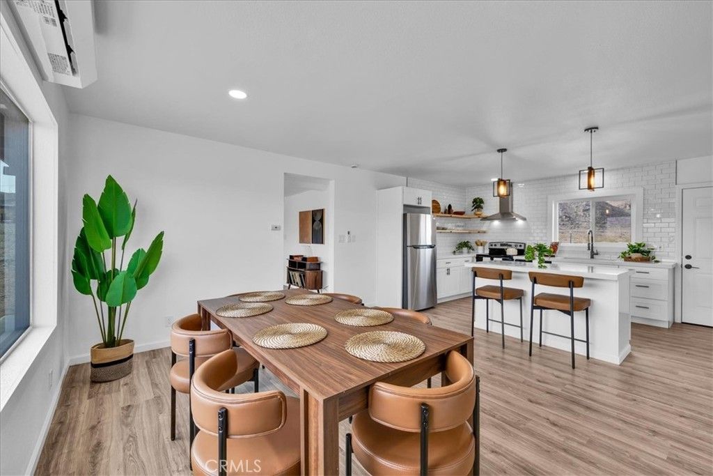 Welcome to 68424 Bellerue Rd, a STUNNING 2-bedroom 1-bath desert home that has been completely renovated to bring you the perfect airbnb, desert home or weekend retreat. This fully-furnished & upgraded modern home is set on 5 ACRES of land (just MINUTES from Joshua Tree) with the most BREATHTAKING desert & mountain views. Inside you'll find a bright & airy living space with fresh paint, warm wood-like flooring, recessed lighting, expansive windows that flood the home with natural light and multiple mini-splits for year round comfort. The split floor-plan flows seamlessly from the living room to the kitchen and dining space where a show-stopping oversized picture window delivers truly jaw-dropping mountain views. The kitchen is thoughtfully designed with beautiful quartz countertops, a center island with bar seating, stainless steel appliances, sleek white cabinetry, floating wood shelves and stylish modern finishes. Both bedrooms are equipped with their own mini-split systems & the primary suite features a spa-inspired bathroom complete with an oversized walk-in shower, rainfall showerhead, contemporary tile flooring, mounted wood shelves and all new vanity, fixtures and finishes. Step outside to your own private desert oasis. A spacious wood deck surrounds a cowboy pool (perfect for cooling off after a long day) while ample space invites stargazing, entertaining or relaxing around a fire-pit under the desert night sky. There is also a finished game-room with additional storage that would also make for a great office, art room or yoga-space. A property like this rarely becomes available, come take a look & let the desert's allure do the rest. Your new desert home or weekend retreat awaits!