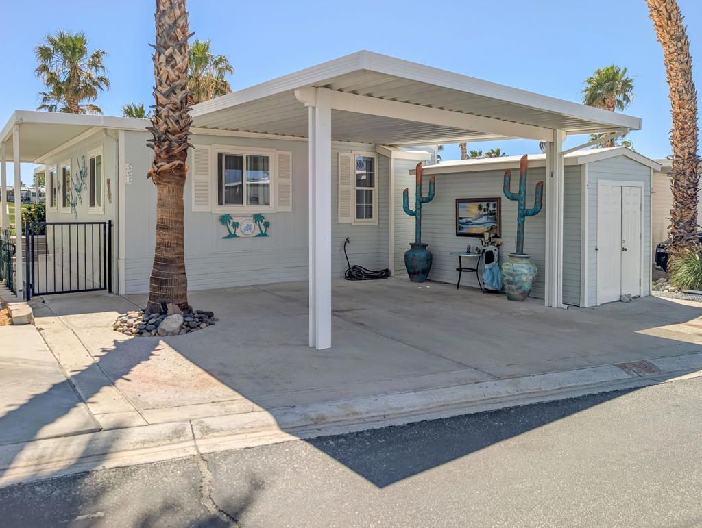 This is a truly unique gem, beautifully maintained and visually striking! The 2002 Hallmark Park Model offers about 800 sq. ft., with 2 bedrooms and 2 bathrooms, and is located on the sought-after 8th hole of the golf course. It has been custom remodeled with features designed to satisfy every need, including designer paint throughout, upgraded backsplashes in the kitchen and bathroom, luxury vinyl plank flooring, stainless-steel appliances (including an efficient dishwasher), a doggie door with a private enclosed run, a paved carport, white-coated roof, and a mini-split system in the spacious, bright California room. There's also a stunning large deck, covered and sheltered from the wind, where you can enjoy breathtaking views and the relaxing sounds of the water feature and greens--making it perfect for entertaining year-round! Caliente Springs is a premier 55+ resort that provides amenities such as a 9-hole golf course, 8 pickleball courts, tennis courts, laundry facilities, a library, and a vibrant community full of events and friendly faces. Come see this well-appointed home and make it your vacation retreat or your permanent residence! Please note: the lot is not owned; space rent is $950.