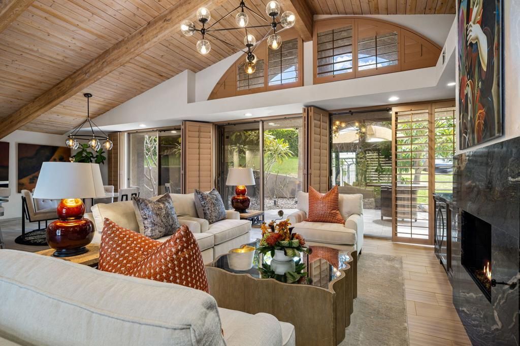 EXTRAORDINARY OPPORTUNITY to own a FULLY RENOVATED, VERY PRIVATE 3-bedroom, 3-bath home in the highly COVETED MOUNTAIN COVE community in the heart of Indian Wells. Enter through wrought iron gates to a stunning private courtyard with oversized travertine pavers, open skylights, swaying palms, and ambient lighting--an ideal outdoor entertaining space.Inside, an open-concept floor plan features vaulted ceilings with natural rough-hewn wood beams, designer furnishings, and curated original artwork throughout. The great room is anchored by a central fireplace and built-in cabinetry with granite countertops, flowing seamlessly to a large wraparound bar with seating for eight--perfect for entertaining.The chef's kitchen is light and bright, offering high-end appliances, granite surfaces, and a large picture window with breathtaking views of the lush greenbelt, fragrant plumeria trees, and stunning San Jacinto Mountains. 5'' painted plantation shutters add warmth and timeless style throughout the home.The flexible floor plan includes a bedroom currently used as a reading retreat with beautiful mountain views, and a secondary bedroom functioning as a primary suite with ample closet space and an updated en-suite bath. The true primary suite, located at the rear, offers a spa-like bathroom with a large walk-in shower, designer fixtures, granite finishes, double vanity with full-height backsplash, and a spacious walk-in closet.Step outside to a private backyard oasis surrounded by lush plumeria and mature landscaping, offering exceptional privacy and stunning mountain views. Additional highlights include a concealed laundry area off the kitchen, and an attached garage with new epoxy flooring and extensive built-in storage. This home is at the end of a very quiet cal-de-sac. Walk to The Indian Wells Golf Course across the street. Residents enjoy discounted golf memberships and other perks when residing in Indian Wells!Offered turnkey furnished with high-end designer pieces and original artwork, this is a VERY RARE opportunity in one of Indian Wells' most coveted, guarded communities. Enjoy 2 community pools, guard-gated security, and beautifully maintained grounds. IID energy service provides LOWER ELECTRIC COSTS, and homeowners also benefit from access to the Hyatt Regency Indian Wells fitness center. Additional privileges include preferred discounts at the Indian Wells Tennis Garden, the Indian Wells Golf Resort, and select nearby spas, dining & shops.
