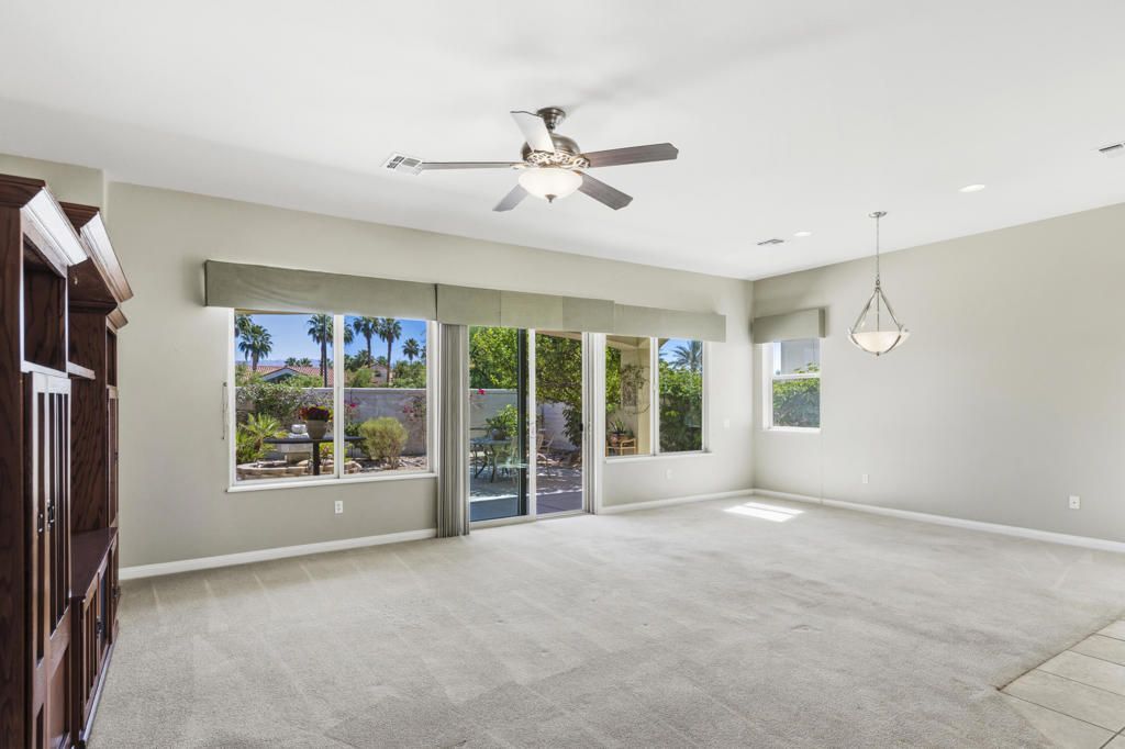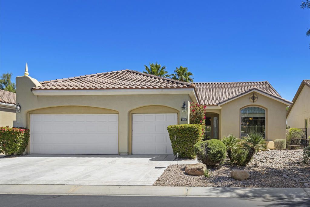 PRICED TO SELL-Don't miss this highly sought-after San Benito model with beautiful views! This spacious home offers an inviting open-concept Great Room featuring an entertainment center cabinet-perfect for relaxing or entertaining. The large primary suite includes direct access to the backyard, while the en-suite bath boasts dual vanities, a soaking tub, separate shower, and a generous walk-in closet. Additional living spaces include a guest bedroom with mirrored doors, a versatile den, bonus room, and a second bathroom-ideal for guests. Ceiling fans are thoughtfully placed throughout the home for added comfort. The well-appointed kitchen is a chef's delight, complete with slab granite countertops, a large center island, double ovens, a five-burner cooktop, built-in microwave, pull-out shelving, and a convenient trash drawer. A bright dining nook with built-in cabinetry provides extra storage and a cozy place to gather. A spacious laundry room with abundant cabinetry and a deep sink leads to the oversized two-car plus golf cart garage, also equipped with built-in storage cabinets. Step outside to your private backyard retreat featuring an extended covered patio, built-in barbeque, and a tranquil water feature-perfect foe enjoying the desert lifestyle. Located in Sun City Shadow Hills, a premier active adult community offering: Two clubhouses, Two fitness centers, a ballroom & activity rooms, a billiard room, Indoor lap pool & outdoor resort-style pools and spas. There are pickleball, tennis & bocce courts, two golf courses(championship & par-3) numerous social clubs and activities. The HOA dues are low and include internet!