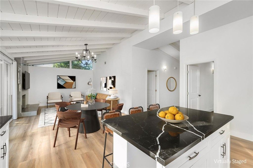 Tucked away on a quiet Winnetka street, this reimagined mid century modern offers both architectural charm and strong investment appeal, featuring a detached ADU that provides immediate rental income and long term flexibility. The main residence spans approximately 1,500 square feet with 4 bedrooms and 3 bathrooms, showcasing classic mid century elements including vaulted post and beam ceilings, clerestory windows, and expansive walls of glass that fill the home with natural light. Open concept living and dining areas flow seamlessly into a renovated kitchen with quartz countertops, stainless steel appliances, and a center island, all designed for easy everyday living and entertaining. Sliding glass doors open to a private yard surrounded by mature landscaping, creating a true indoor outdoor experience. The detached, approximately 500 square foot 1 bedroom, 1 bath ADU, completed in 2022, includes a full kitchen and washer and dryer hookups and is currently tenant occupied, delivering immediate income. Set on a spacious corner lot within a well established neighborhood, this property blends timeless design, modern updates, and built in income potential, ideal for both owner users and investors alike.