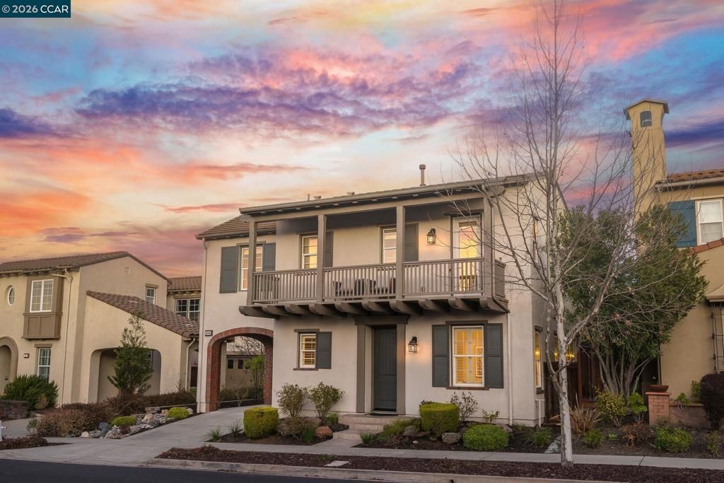 OPEN SATURDAY & SUNDAY 4/18 & 4/19 1:30-4:00PM Discover Shapells signature of quality in this stylish and highly desirable Cottonwood plan #2 residence perfectly located on a quiet court in the prestigious Alamo Creek neighborhood. Built in 2007, this timeless Monterey style home offers 2,761 SqFt of well-designed living space including 4 bedrooms, 3.5 bathrooms, a kitchen, family room, and breakfast nook open floor plan concept, elegant formal living and dining rooms, two convenient tech/study areas, large balcony with stunning views of Mt. Diablo, and a practical porte-cochere driveway with a 2 car garage. Many top-quality upgrades such as designer interior and exterior colors, custom wood shutters, beautiful hardwood flooring, baseboards and crown molding throughout, Andersen doors, a new culinary kitchen including shaker white cabinetry with custom lighting, marble countertops, expansive island with convenient eating bar, high-end stainless steel appliance package including Zline six burner gas cooktop, dishwasher, microwave and GE monogram refrigerator, Nest smart zone system, EV charger, and so much more! This striking property is ideally situated on a professionally water-smart landscaped lot with an avant-garde patio, sun shades, stunning water feature and built-in BBQ.