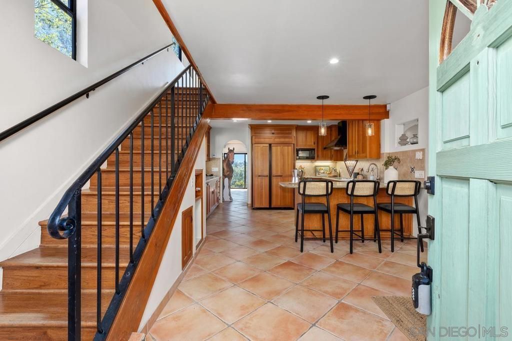 4.4-acre gated horse property with panoramic views, usable land, and a complete equestrian setup just minutes from downtown Fallbrook. This solar-powered 3BR/2BA home is designed to take advantage of the setting, with large picture windows, exposed beam ceilings, and seamless indoor-outdoor flow to an expansive view deck. The main living space centers around a fireplace and connects to a well-appointed kitchen with custom cabinetry, high-end appliances, and an eat-in dining area that works for daily living and entertaining. Upstairs, the primary suite acts as a private retreat with its own fireplace, walk-in closet, spa-style bath, and direct access to a view deck overlooking rolling hills. The property is fully equipped for horse use with a 4-stall barn (including foaling stall), tack room, wash rack, arena, and three paddocks, along with rubber-matted stalls and hot/cold water. An attached studio with bath and kitchenette provides flexible space for guests, office, or ADU/long-term occupancy. 33 owned solar panels, RV carport, storage sheds, and a well-balanced layout complete the offering.